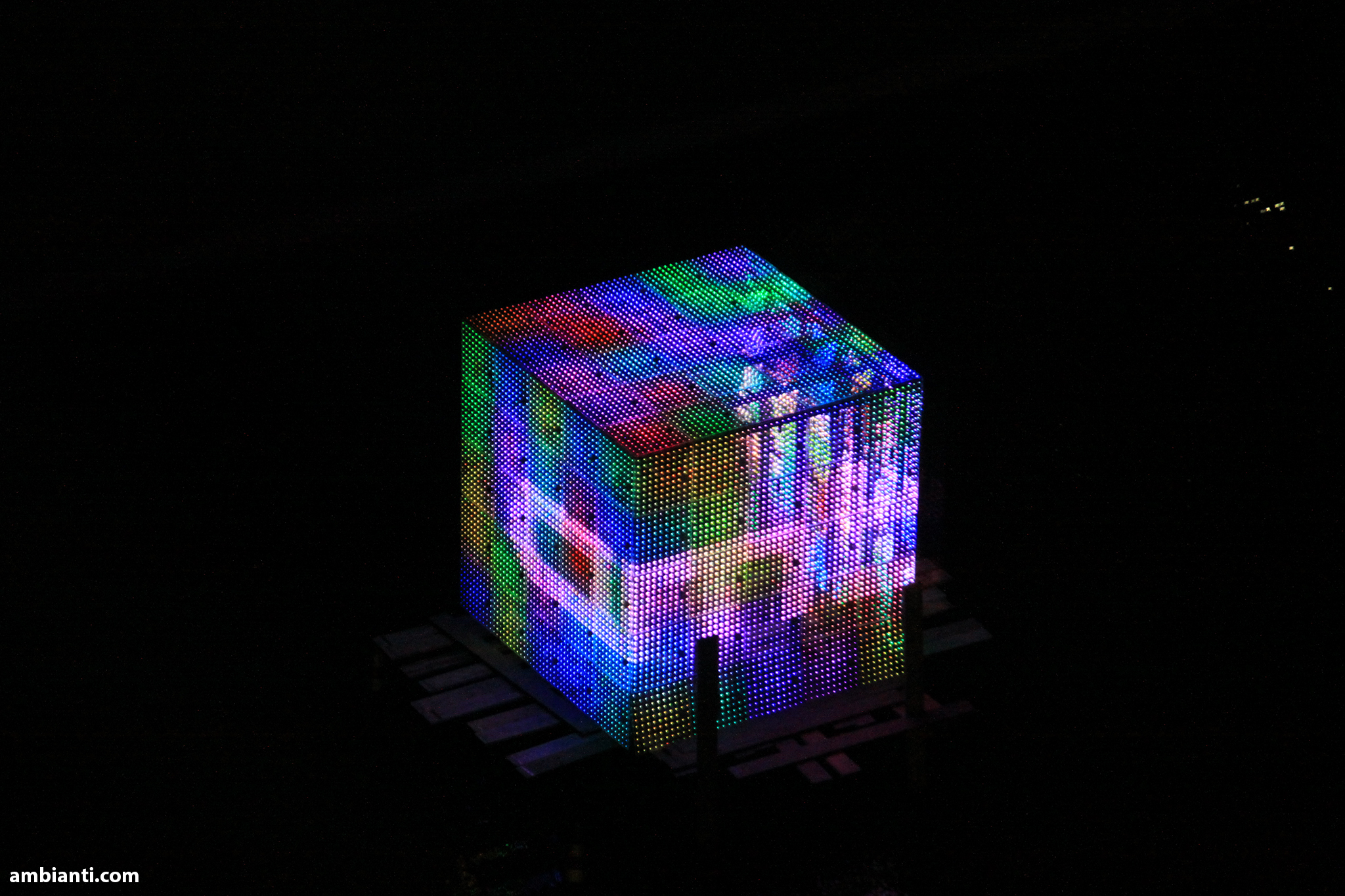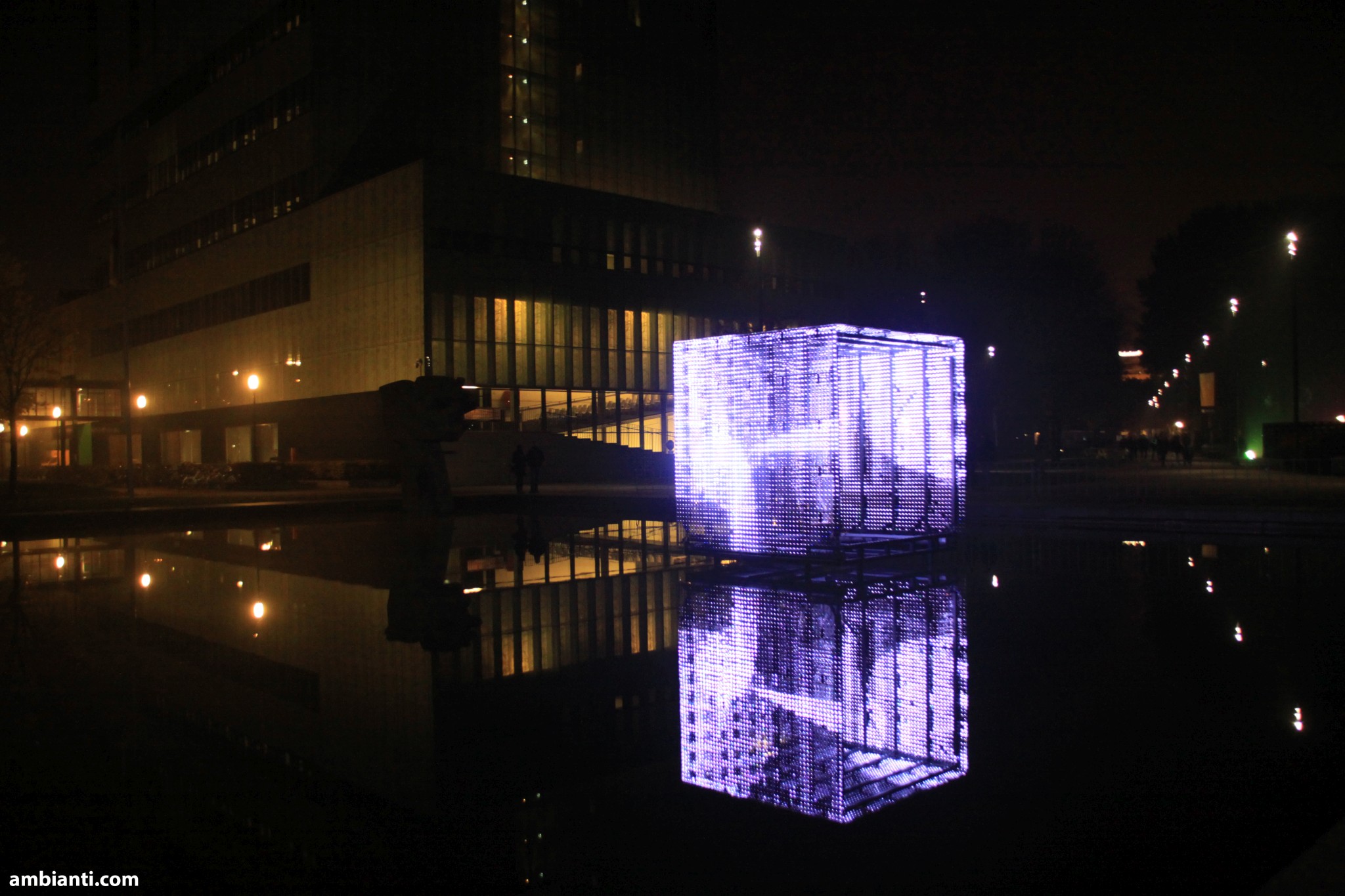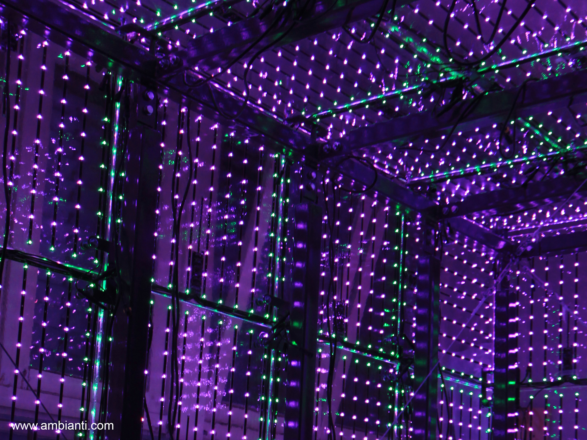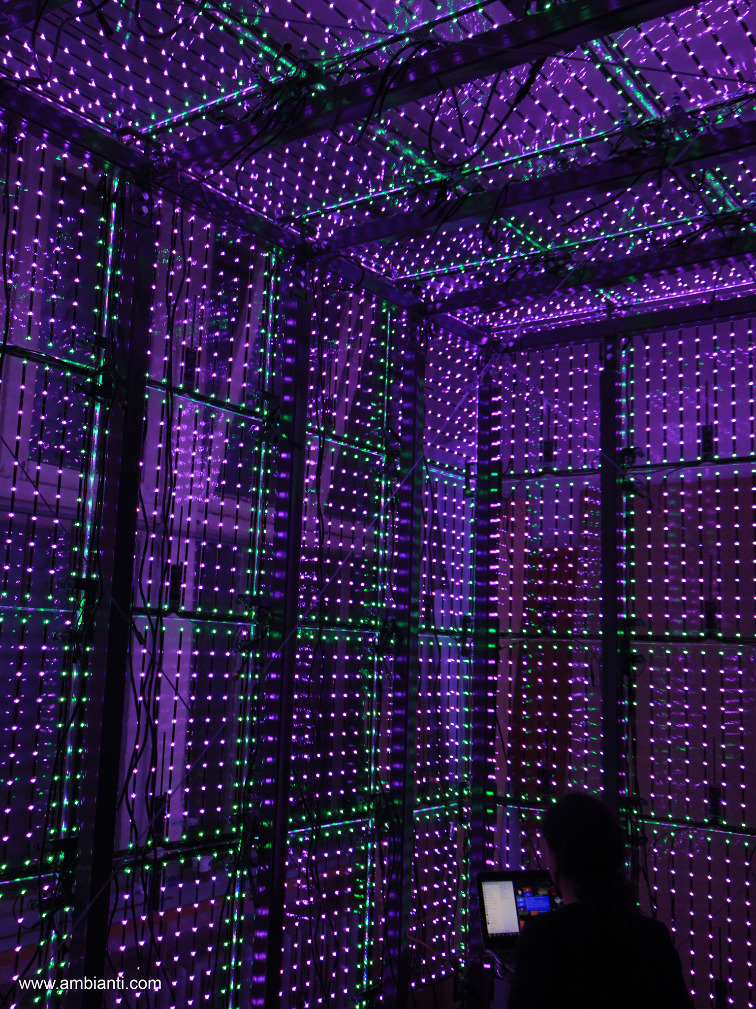 Caption: To reciprocate the movements of the Moholy-Nagy’s sculpture, located kilometers away at the Van Abbemuseum exhibition, on the cube’s walls, the total of 20 000 LEDs are directed algorithmically by the new version of Ambianti’s fully distributed operating system, TileOS