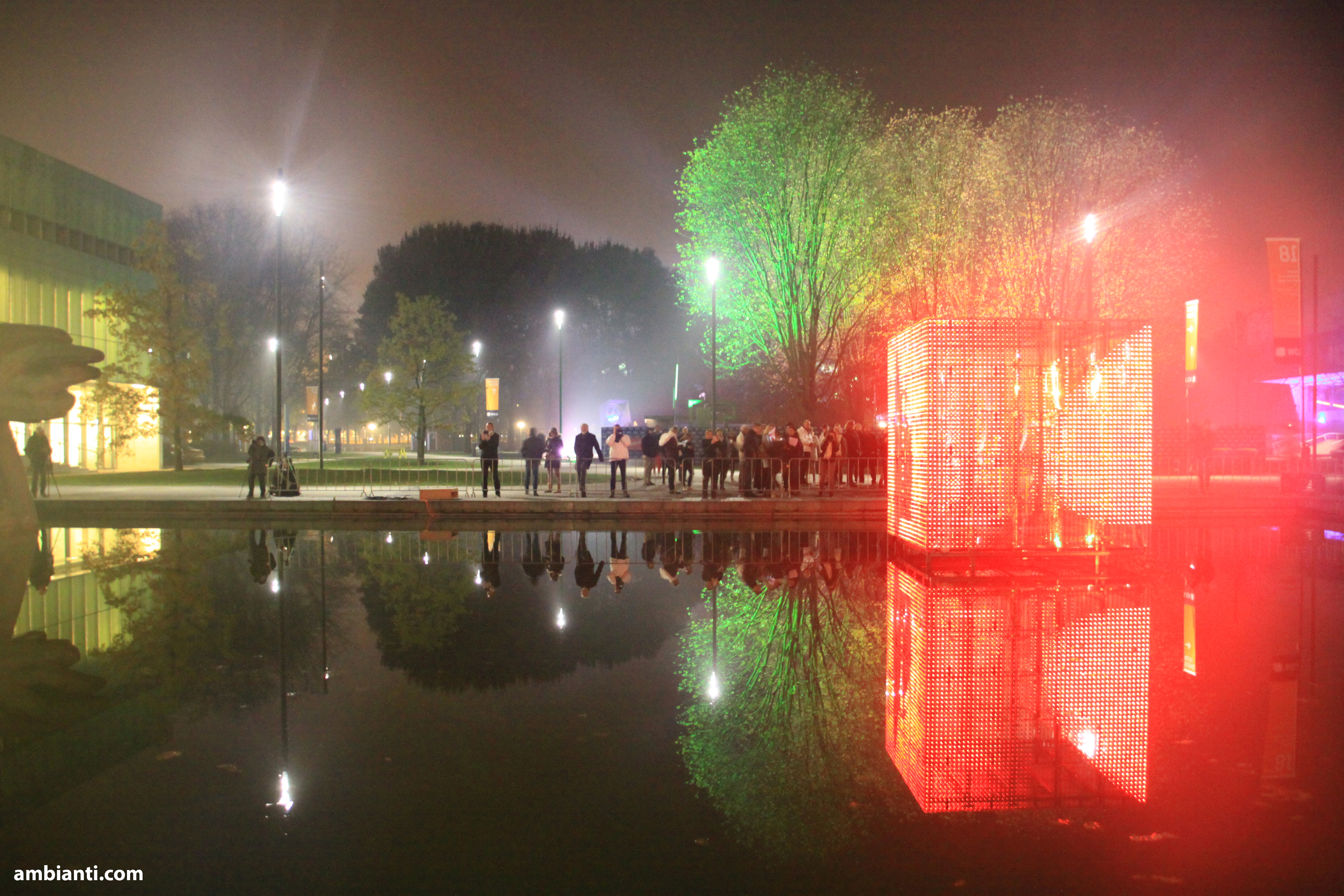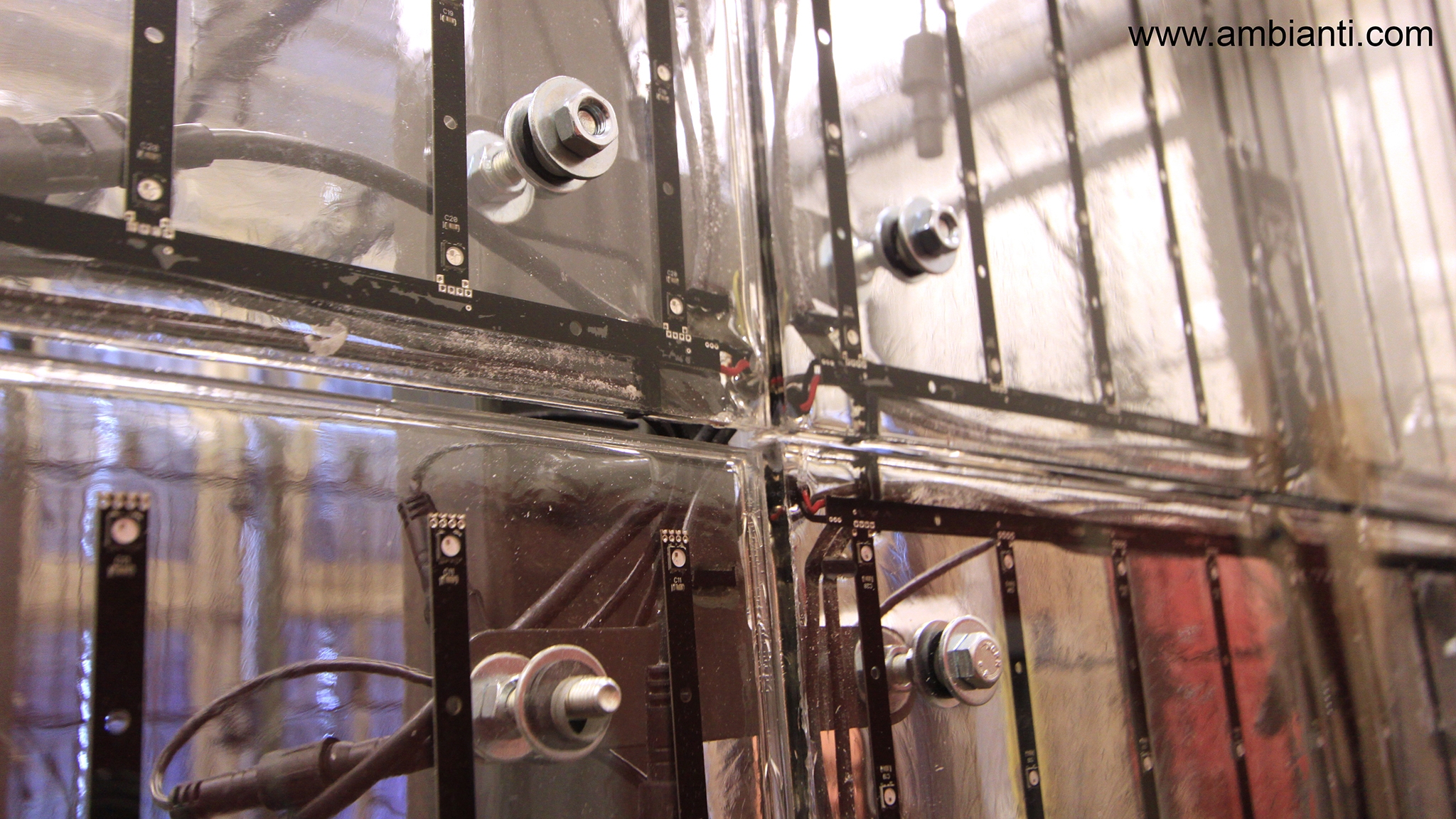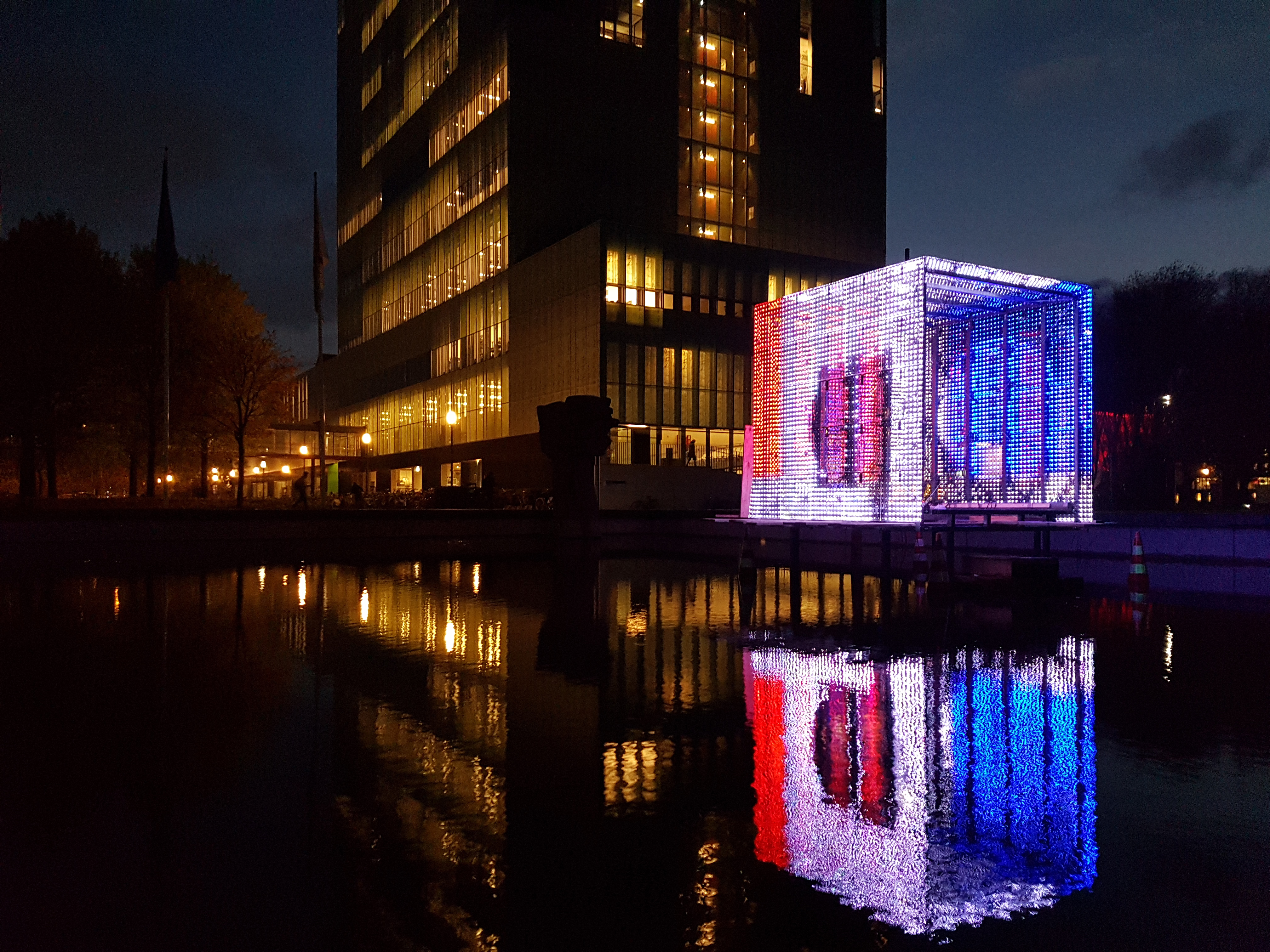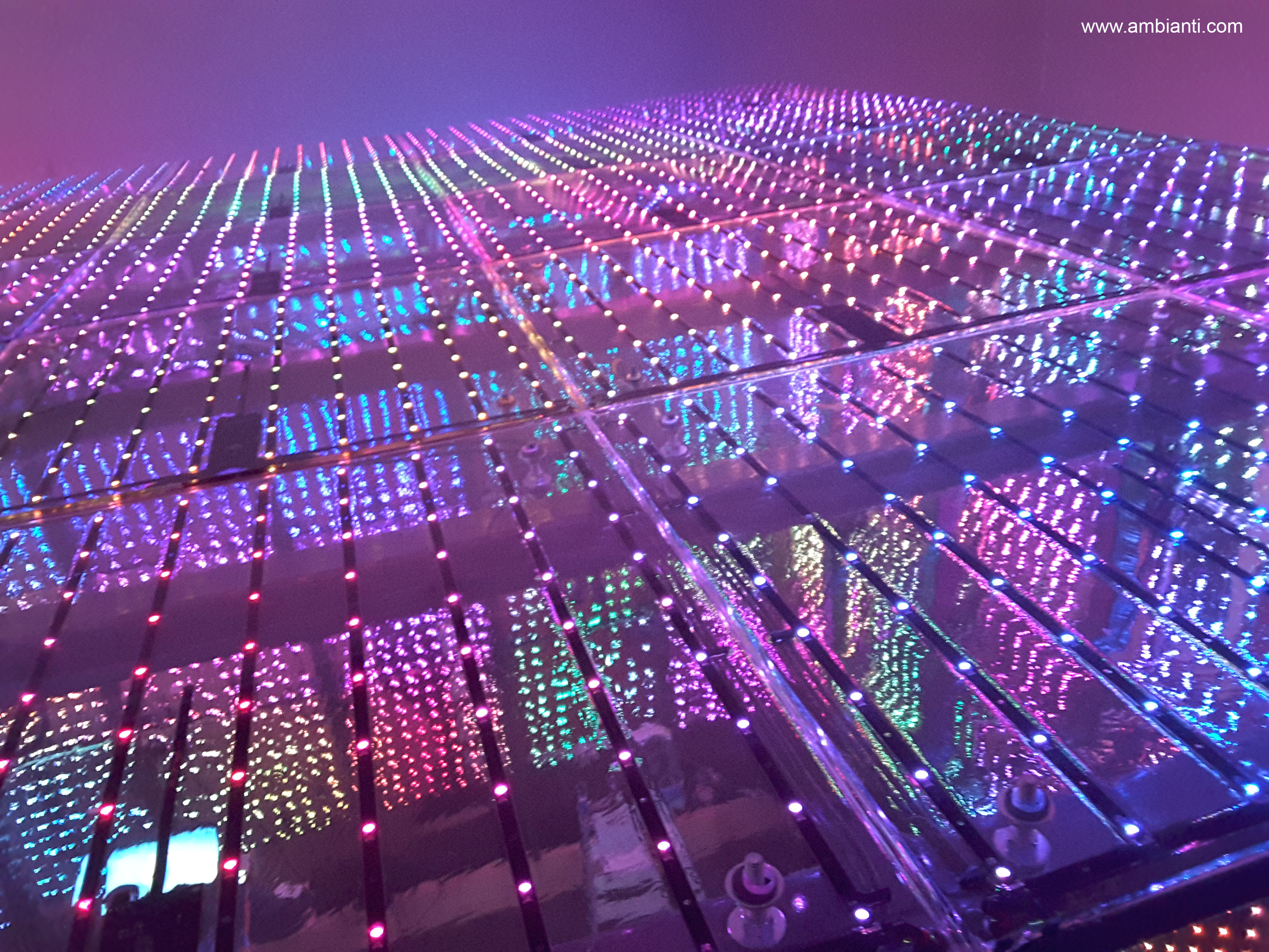 Caption: To reciprocate the movements of the Moholy-Nagy’s sculpture, located kilometers away at the Van Abbemuseum exhibition, on the cube’s walls, the total of 20 000 LEDs are directed algorithmically by the new version of Ambianti’s fully distributed operating system, TileOS