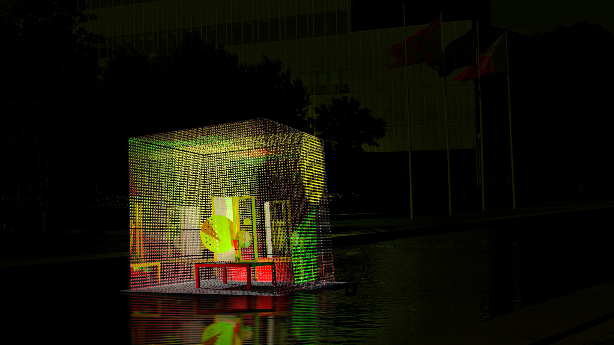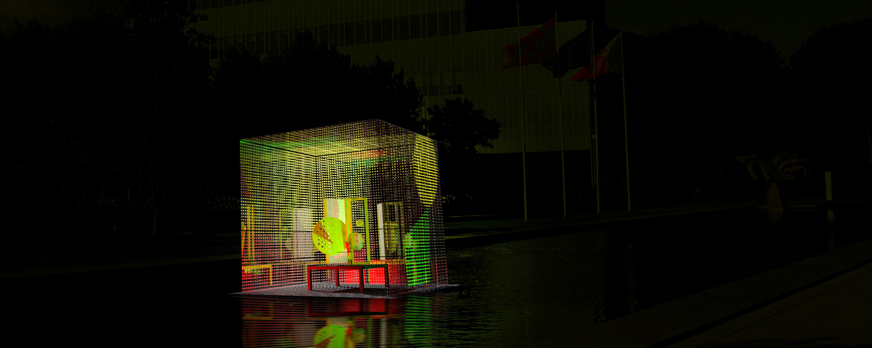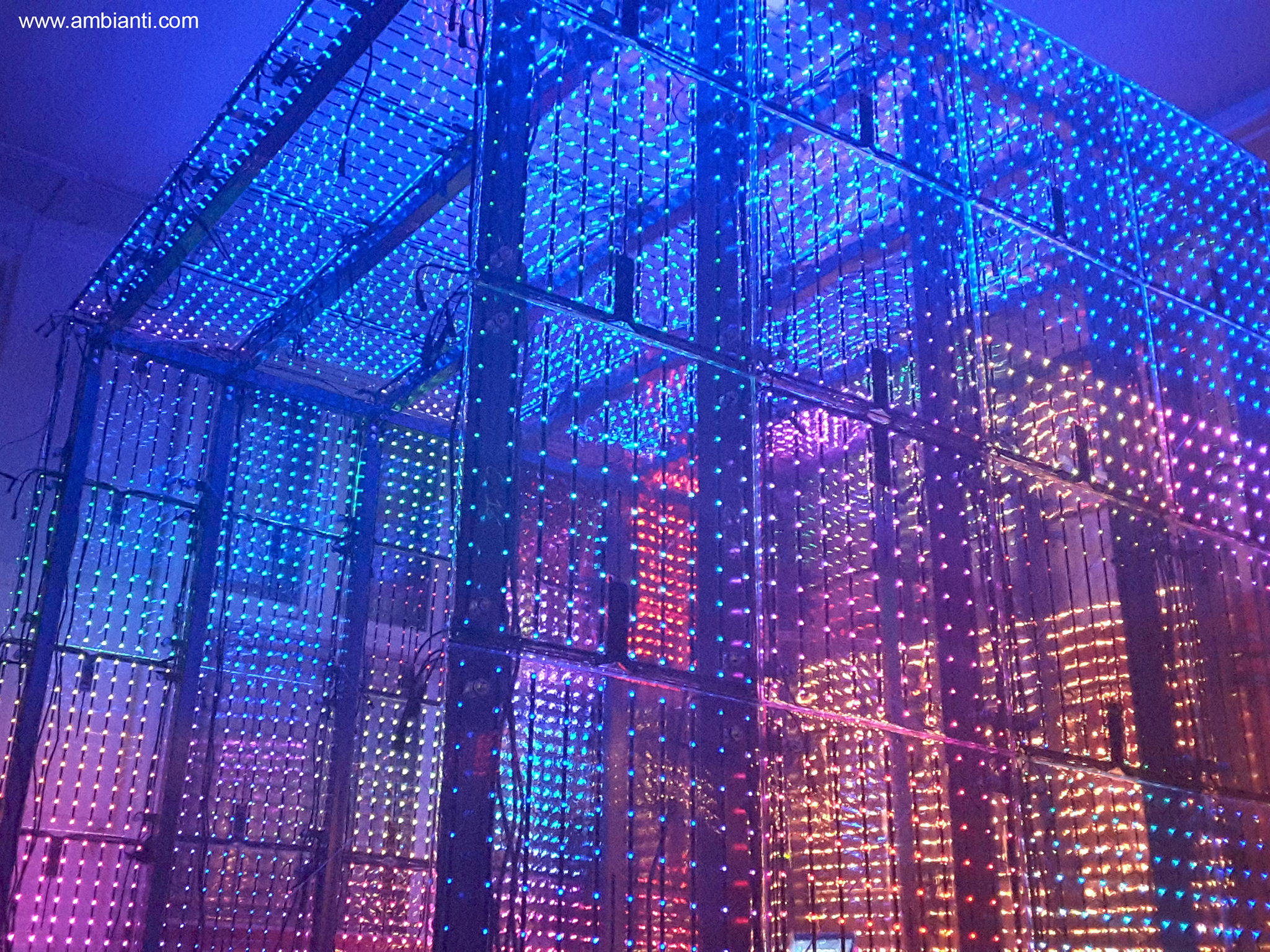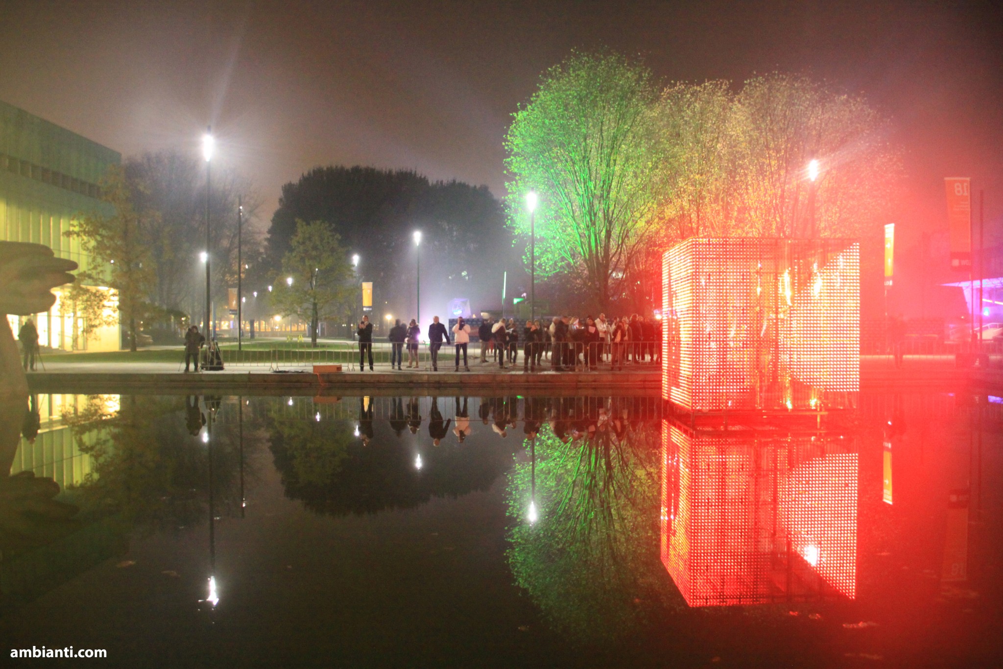 Caption: To reciprocate the movements of the Moholy-Nagy’s sculpture, located kilometers away at the Van Abbemuseum exhibition, on the cube’s walls, the total of 20 000 LEDs are directed algorithmically by the new version of Ambianti’s fully distributed operating system, TileOS