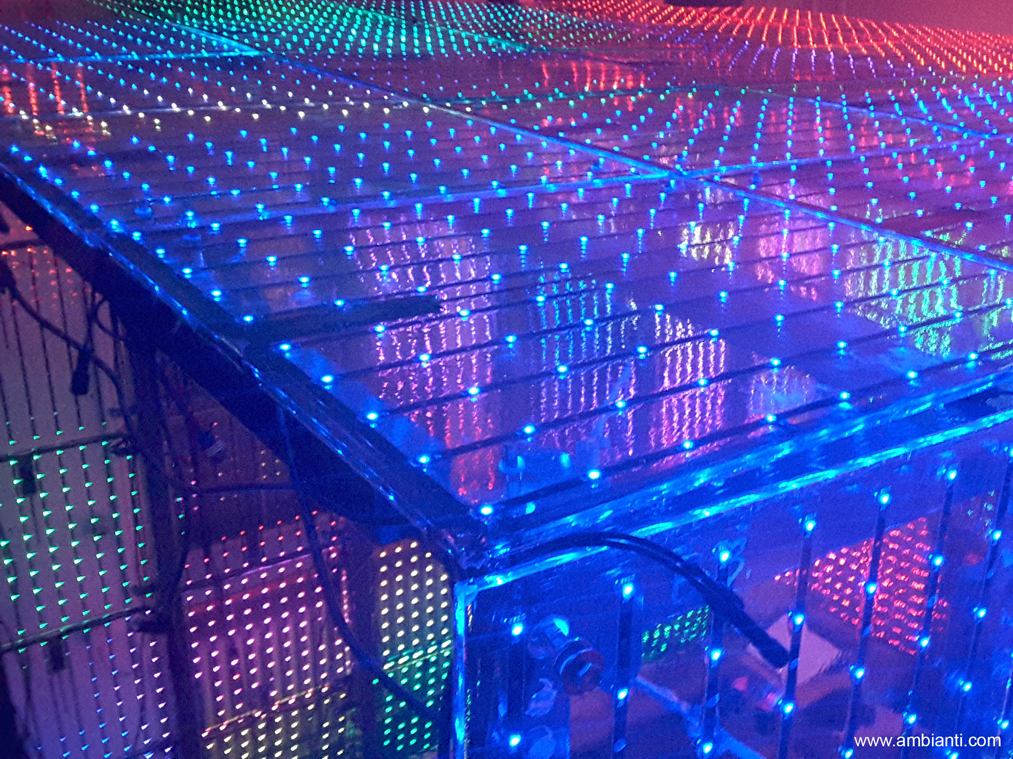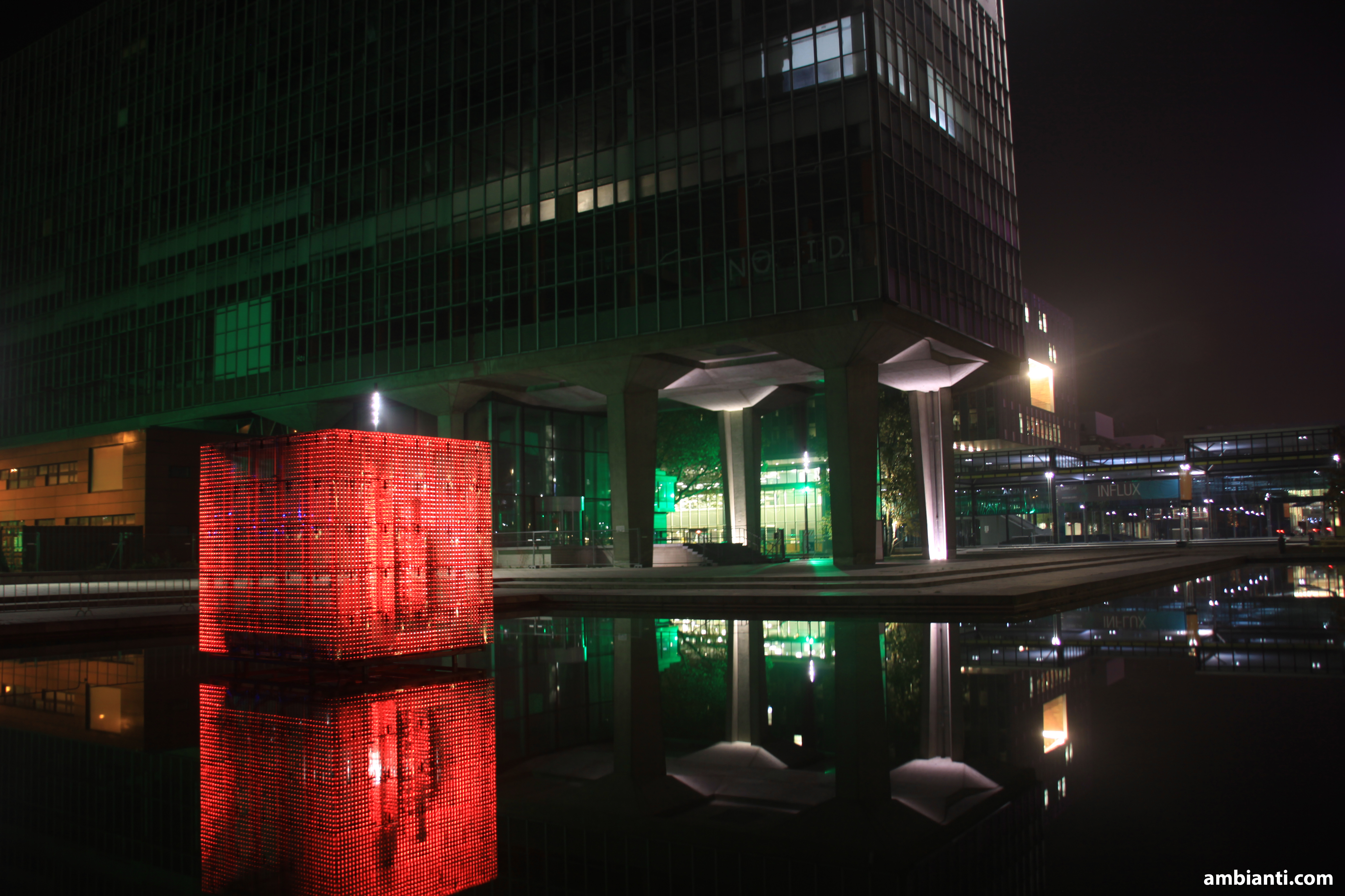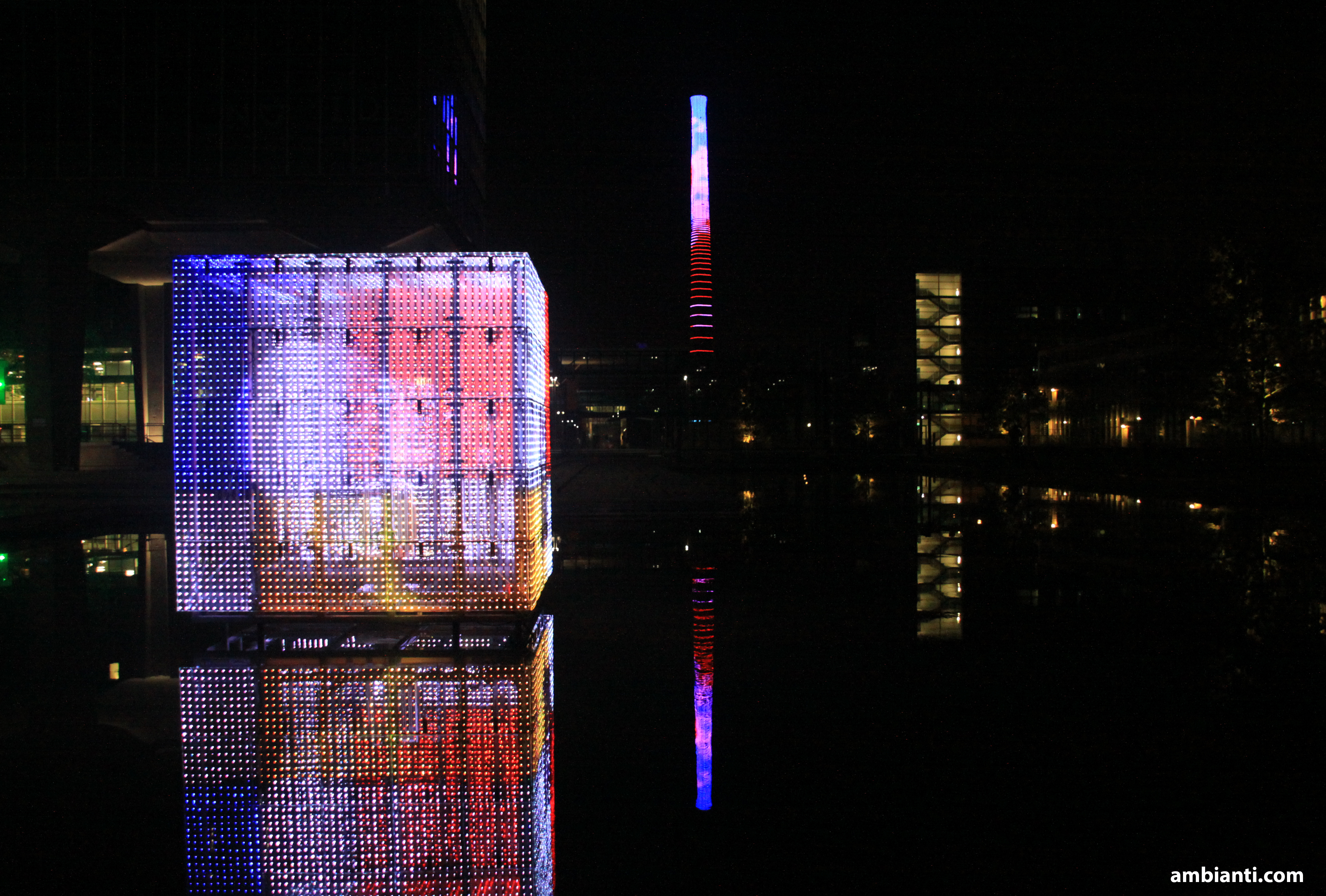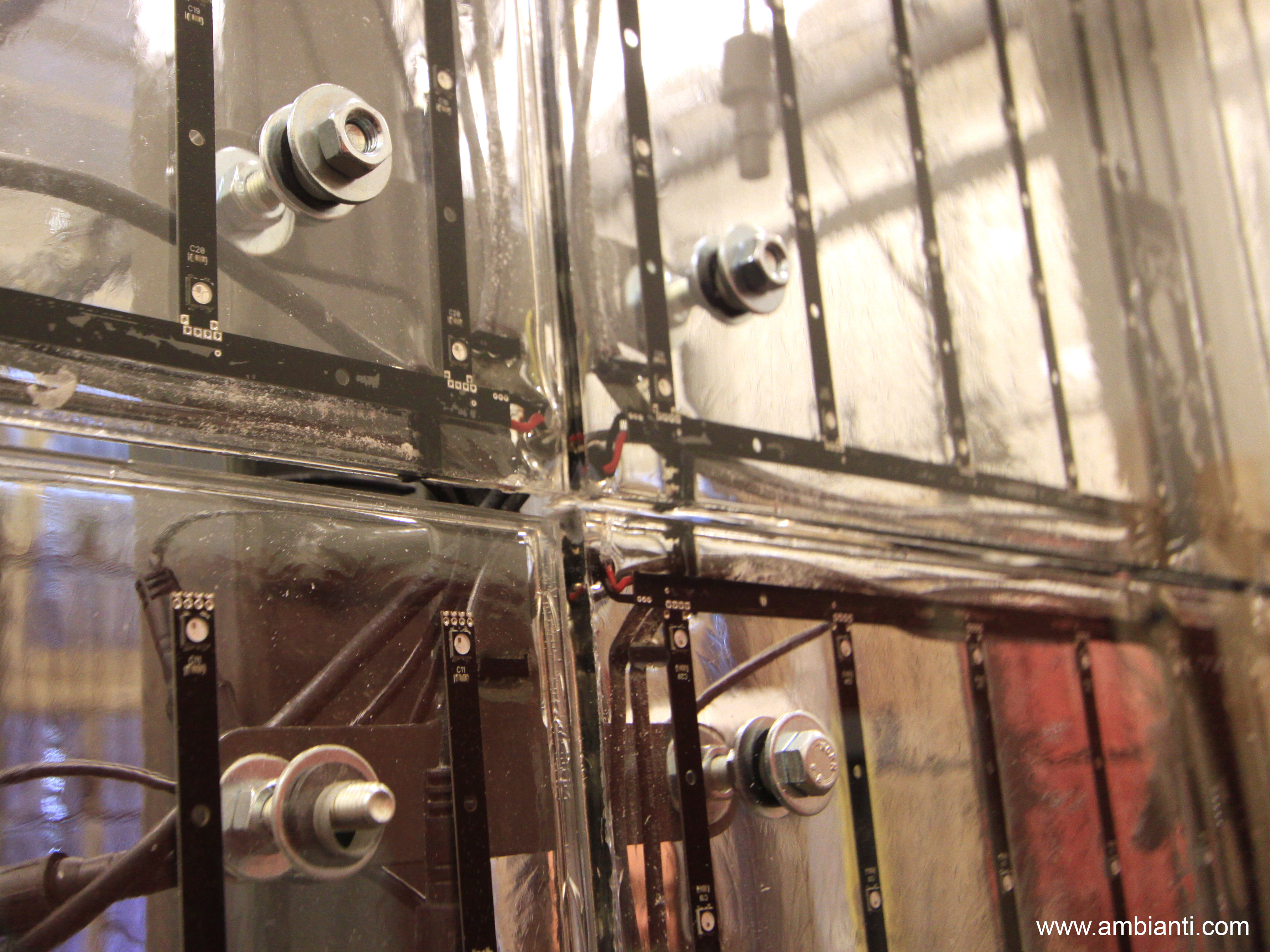 Caption: To reciprocate the movements of the Moholy-Nagy’s sculpture, located kilometers away at the Van Abbemuseum exhibition, on the cube’s walls, the total of 20 000 LEDs are directed algorithmically by the new version of Ambianti’s fully distributed operating system, TileOS