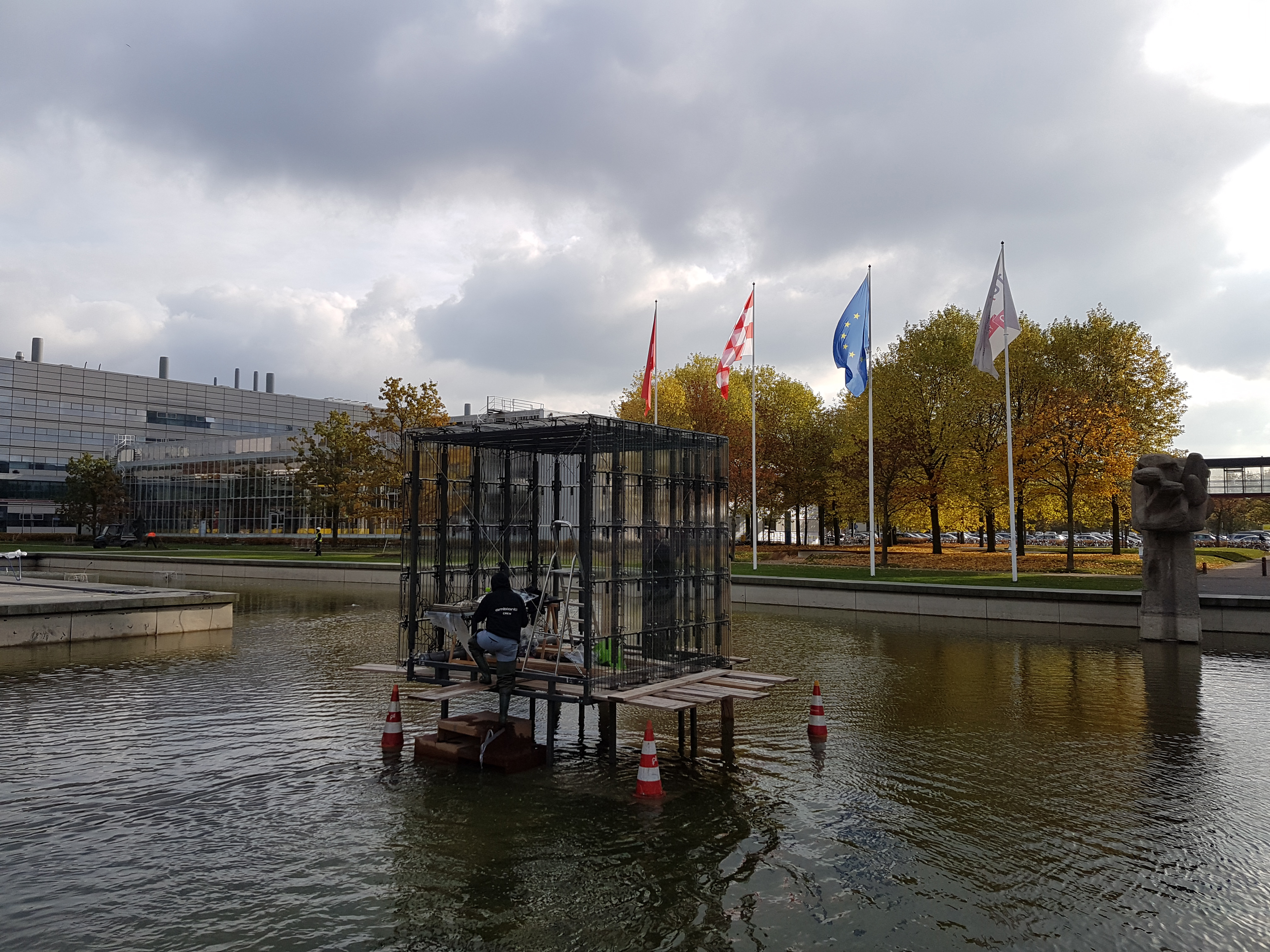 Caption: The visual appearance of the tiles as well as the cube’s supportive steel frame and rotating podium have also been specially designed by Ambianti to respect the Bauhaus’ school traditions and amplify the airy, austere and sharp impressions of the original work of Moholy-Nagy, located at the Van Abbemuseum.