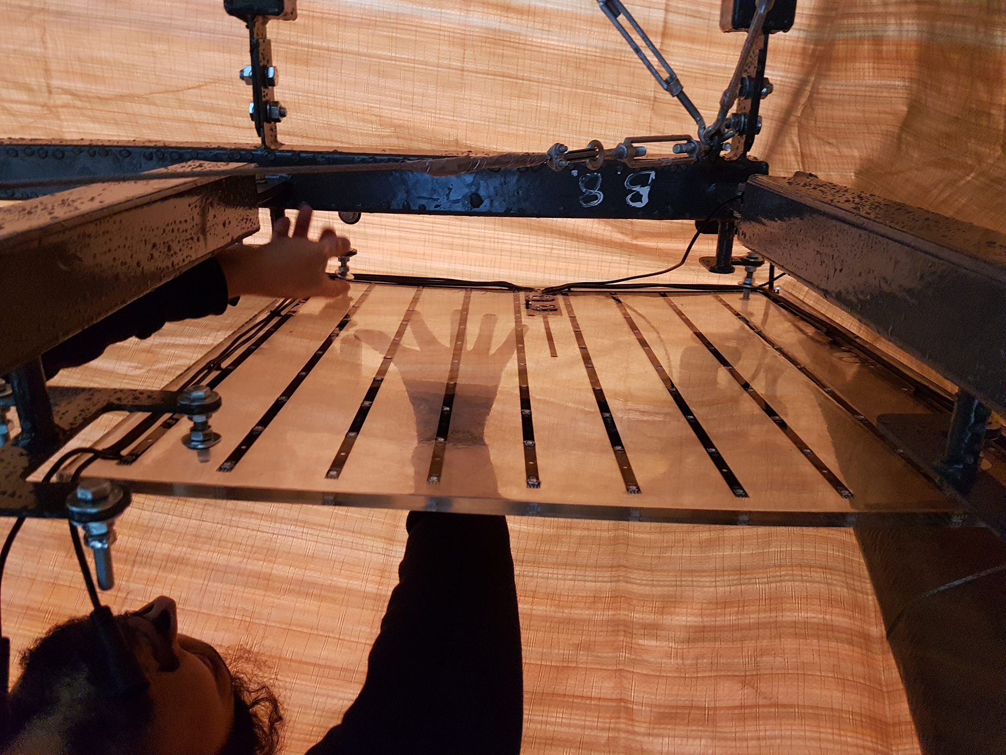 Caption: Ambianti Tiles independently recognize each other’s position and shape, communicating and adjusting their status to extrapolate the movements and the lighting patterns of the original sculpture of Moholy-Nagy, located at the Van Abbemuseum, and transfer them onto the cube’s walls.